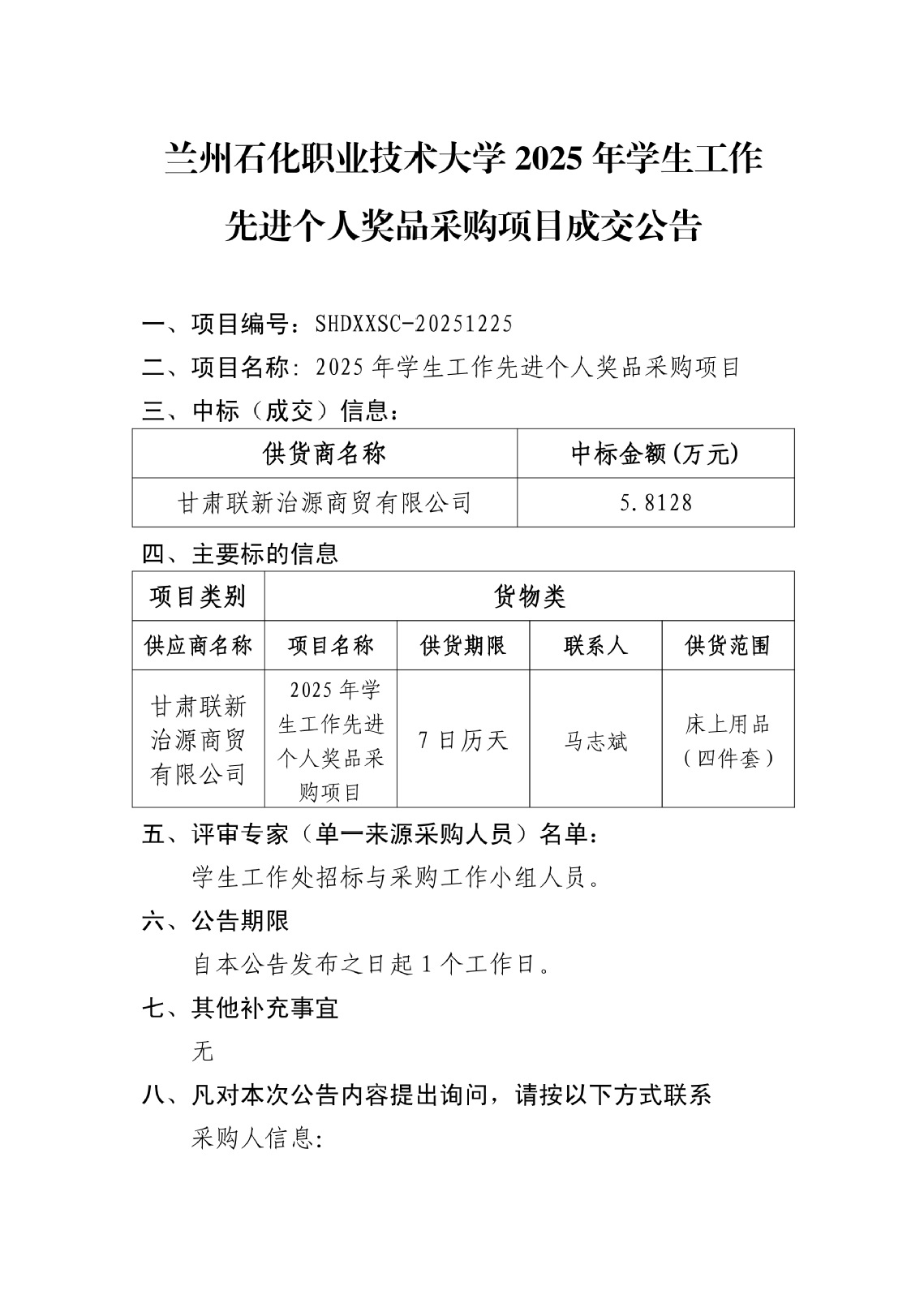 一、项目编号:SHDXXSC-2026-01二、项目名称:2026年学生公寓旧床改造项目三、中标(成交)信息:供货商名称中标金额(万元)备注甘肃聚富成科贸有限公司16.7660四、主要标的信息项目类别货物类供应商名称项目名称供货工期项目经理供货范围甘肃聚富成科贸有限公司2026年学生公寓旧床改造项目60日历天谢鹏拆除444个床;转运、搬运668个床;安装444个床;4.安装磨砂玻璃门一个。评审专家(单一来源采购人员)名单:学校国有资产管理处、学生工作处招标与采购工作小组人员。六、公告期限自本公告发布之日起1个工作日。七、其他补充事宜无八、凡对本次公告内容提出询问,请按以下方式联系采购人信息:名