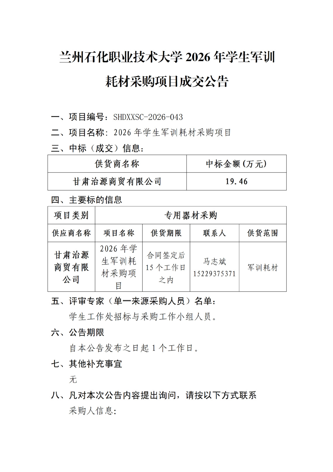 一、项目编号:SHDXXSC-2026-01二、项目名称:2026年学生公寓旧床改造项目三、中标(成交)信息:供货商名称中标金额(万元)备注甘肃聚富成科贸有限公司16.7660四、主要标的信息项目类别货物类供应商名称项目名称供货工期项目经理供货范围甘肃聚富成科贸有限公司2026年学生公寓旧床改造项目60日历天谢鹏拆除444个床;转运、搬运668个床;安装444个床;4.安装磨砂玻璃门一个。评审专家(单一来源采购人员)名单:学校国有资产管理处、学生工作处招标与采购工作小组人员。六、公告期限自本公告发布之日起1个工作日。七、其他补充事宜无八、凡对本次公告内容提出询问,请按以下方式联系采购人信息:名